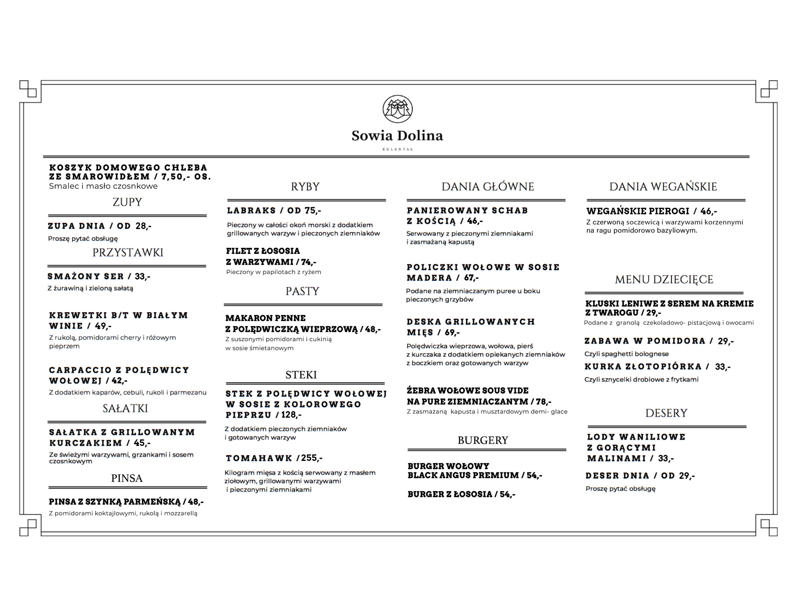 Our menu has something for everyone! From the classic pork loin to delicious fish such as cod, sea bass or monkfish. For meat lovers, we recommend the juicy Polish beef tenderloin steak, and for real connoisseurs, the impressive Tomahawk steak.